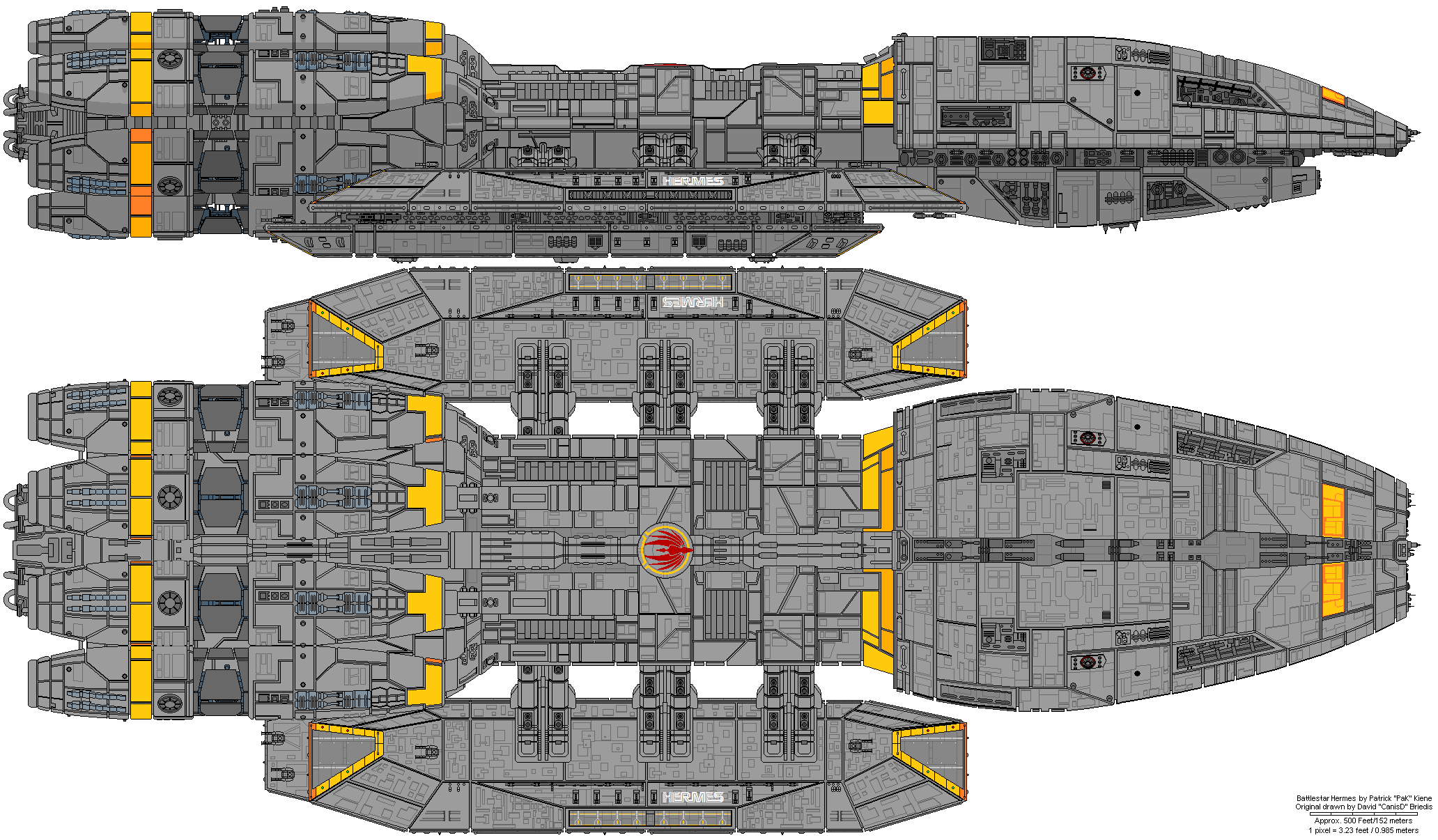 - Große Frachträume befinden sich im unteren Teil des Mittschiffs, dort sind auch die Lagerräume für die Munition und den Treibstoff der Fliegerstaffeln. Der Treibstofftank für die Hermes selbst befindet sich im unteren Teil der Engineering-Sektion auf Decks 48-52E.